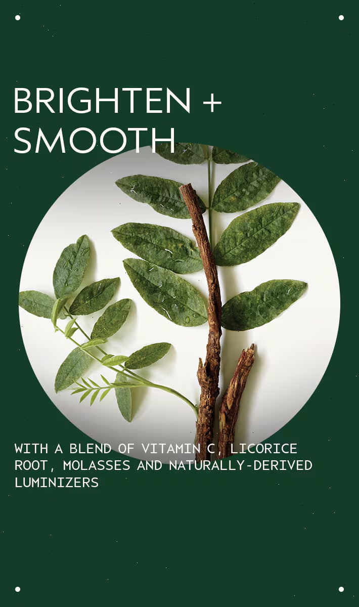 Over time, licorice root and molasses help to visibly brighten dull skin, reducing the appearance of dark spots and evening the look of skin tone.